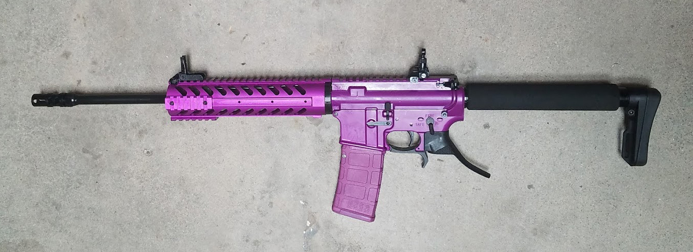 This may look really funny, but this thing gets around the California Assault Weapons laws. No bullet button. No Flash hider. No vertical grip. No folding/collapsing stock. And all mangenta! And...
